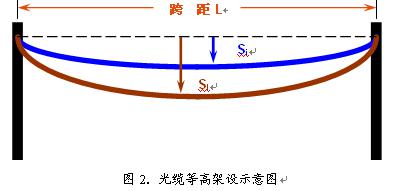當(dāng)光纜的氣象條件確定后,可以按照客戶要求的跨距和芯數(shù)進(jìn)行設(shè)計了.ADSS光纜有等高和不等高架設(shè)兩種方式,圖2為等高架設(shè)時光纜的懸掛情況.